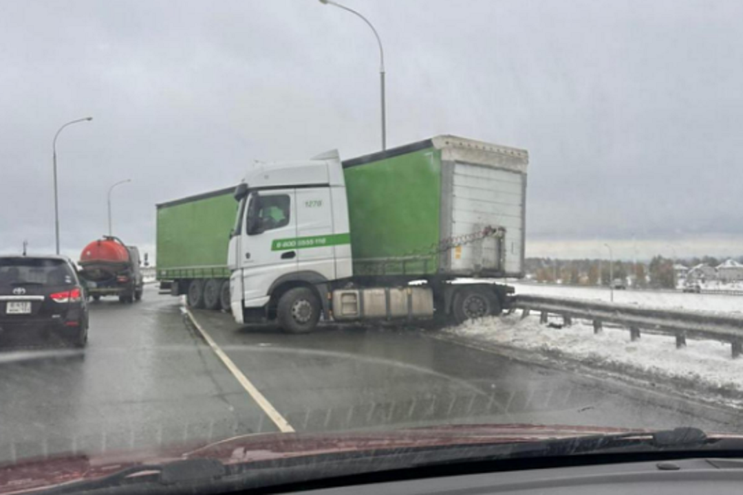 На снимке с места происшествия видно, как большегруз врезался в металлический барьер. В результате одна полоса движения оказалась полностью перекрыта, движение затруднено.