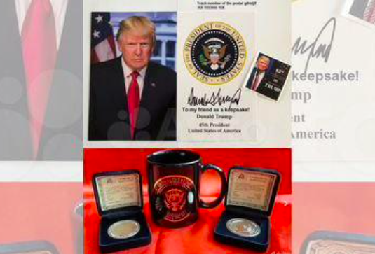 Продавец предлагает к приобретению набор, включающий две памятные медали, покрытые слоем золота 999-й пробы, а также кружку из фарфора с нанесенным золотым изображением американского политика, сообщает Сиб.фм.