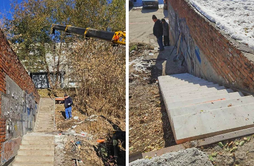 Исполнителем выступает муниципальное учреждение "Калининское". Реставрация лестницы стала ответом на обращения местных жителей с улиц Столетова и Макаренко.