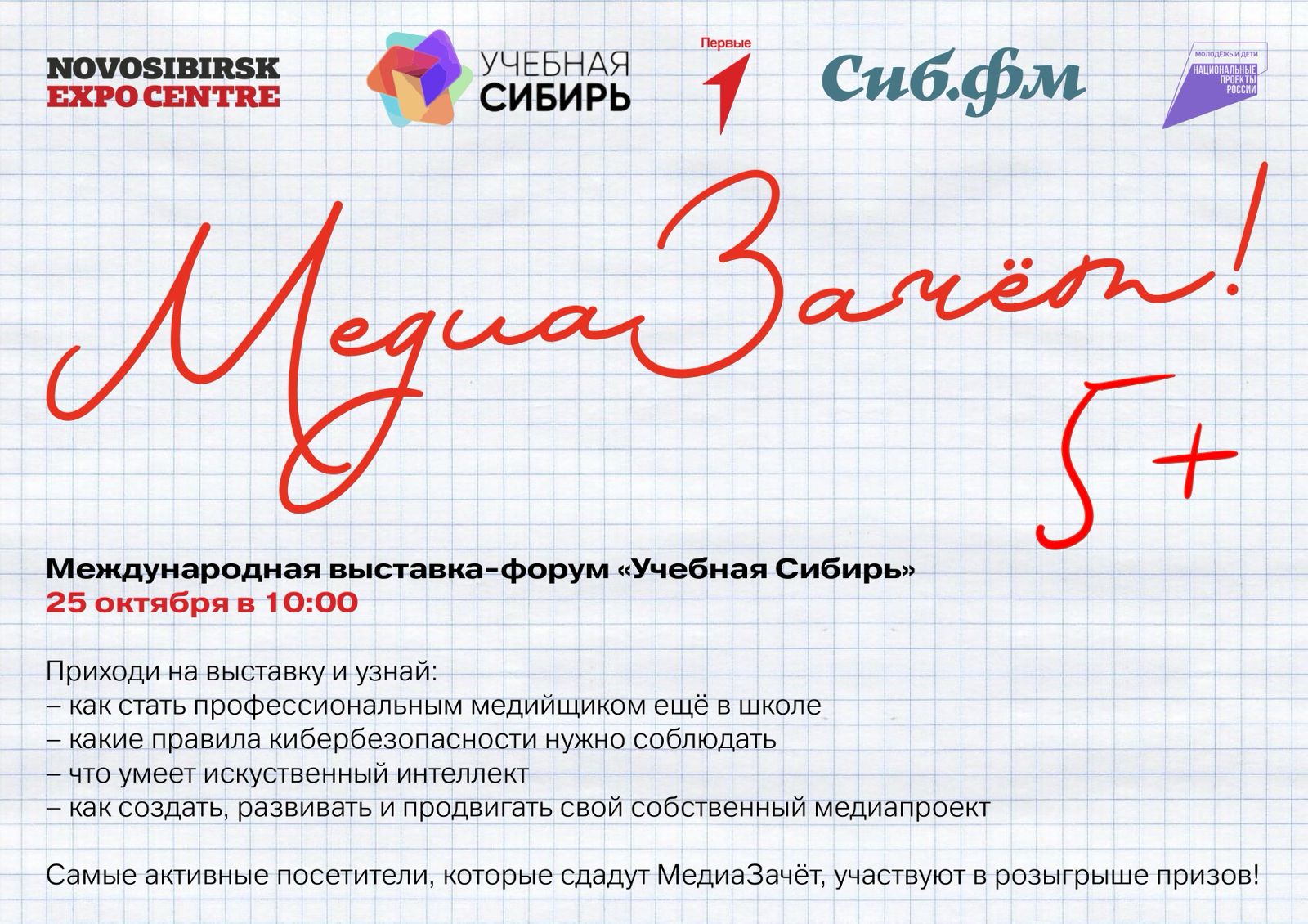 Фестиваль «Медиазачет», организованный Сиб.фм совместно с Движением первых, пройдет уже совсем скоро – 25 октября в рамках Международной форум-выставки «Учебная Сибирь».