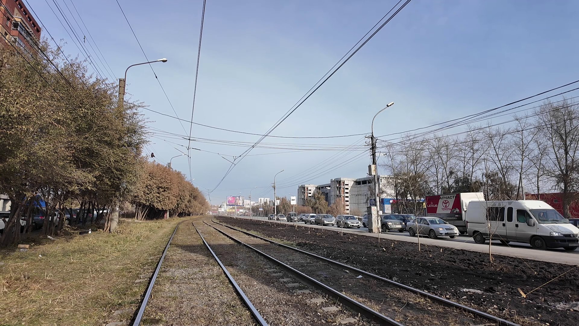 На участке от улицы Доватора до улицы Есенина вдоль трамвайных путей высадили 95 крупных тополей и заменили грунт на плодородный чернозём, работы завершат посевом газона весной.