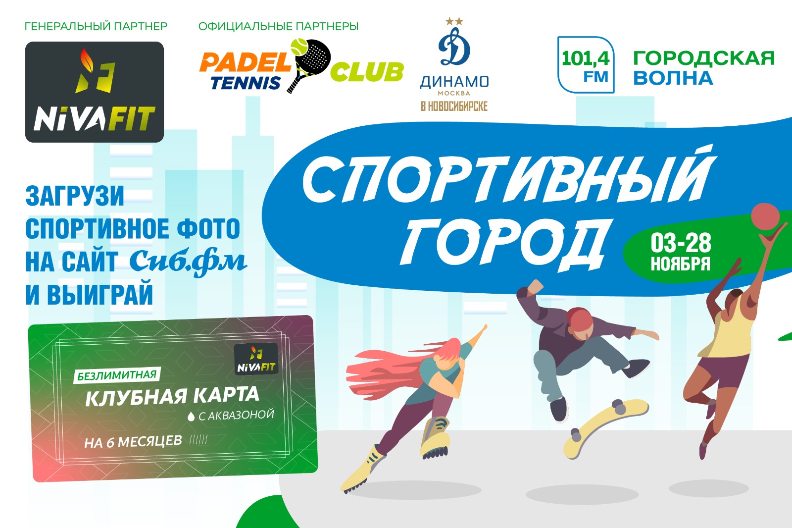 Переключитесь от монотонных тренировок и покажите, как вы по-настоящему увлечены спортом. С 3 по 28 ноября отправляйте снимки с пробежек или из зала на сайт sib.fm, чтобы побороться за главный приз от генерального партнёра проекта. Победителю достанется полугодовая безлимитная клубная карта с доступом в аквазону фитнес-центра NivaFit.