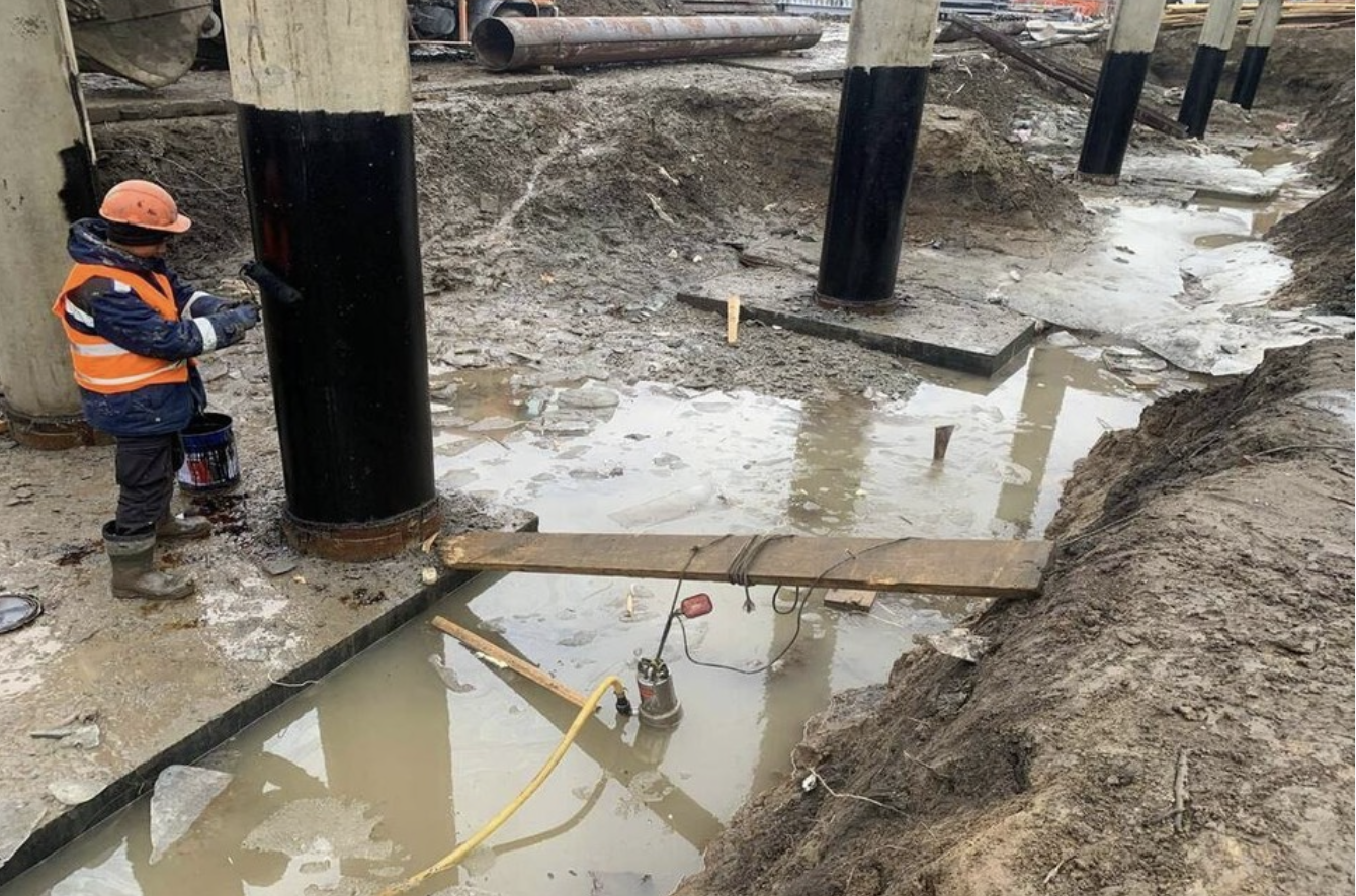 Со стороны Дзержинского района сейчас ведутся работы по гидроизоляции опор, армированию, опалубке и бетонированию опорной площадки. На противоположной стороне специалисты изготавливают каркасы опор №1–4, монтируют стойки опоры №5 и проводят подготовительные земляные работы.
