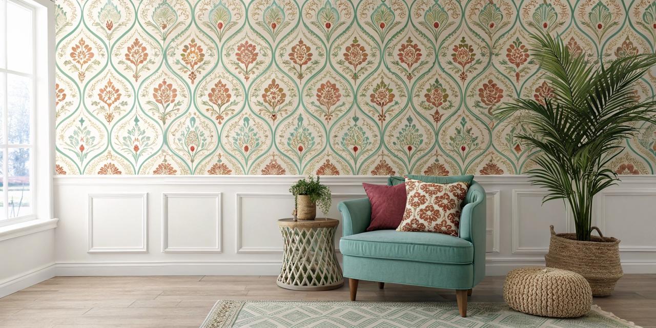 Держатся позиции у природных мотивов: крупные листья, пейзажи, мягкая графика. Геометрия остаётся универсальным инструментом — она помогает корректировать пропорции и задаёт ритм интерьеру.