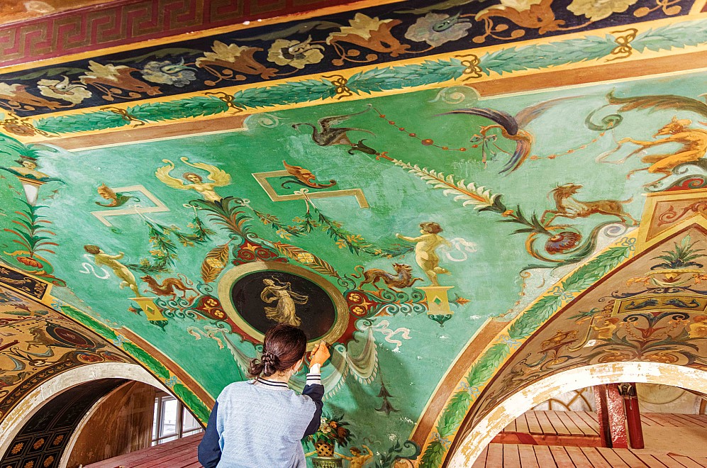 Во всем здании оштукатуривают стены, так как оригинальная штукатурка была сильно повреждена или утрачена, а в специальных образцовых помещениях проводят подготовительные работы для финального этапа реставрации. Специалисты подбирают колера для окраски стен и реставрации паркета. Цветовые решения тщательно выверяют с помощью архивных данных и натурных исследований, чтобы обеспечить максимальное соответствие историческому облику.