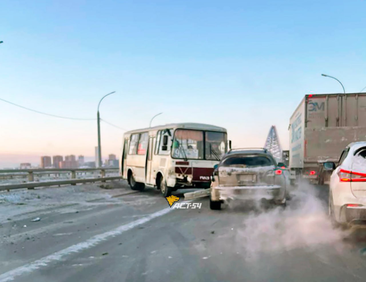 «Пазик» с «Инфинити» заблокировали проезд по Бугринскому мосту