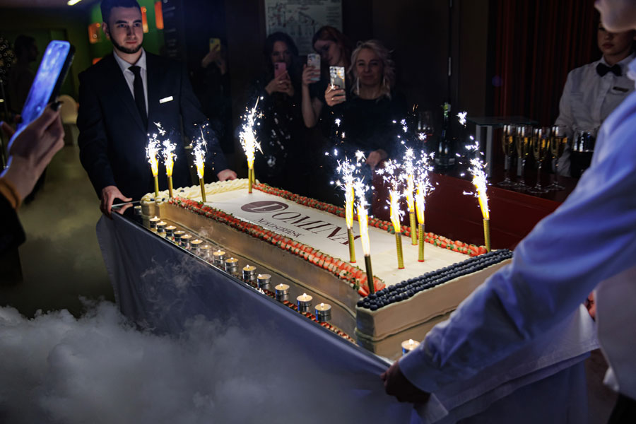 Кульминацией праздника стал огромный роскошный торт – настоящий красавец в обрамлении свечей и бенгальских огней. Генеральный директор отеля Юлия Караулова собственноручно его разрезала и адресовала первый кусочек мне – это было неожиданно и очень приятно!