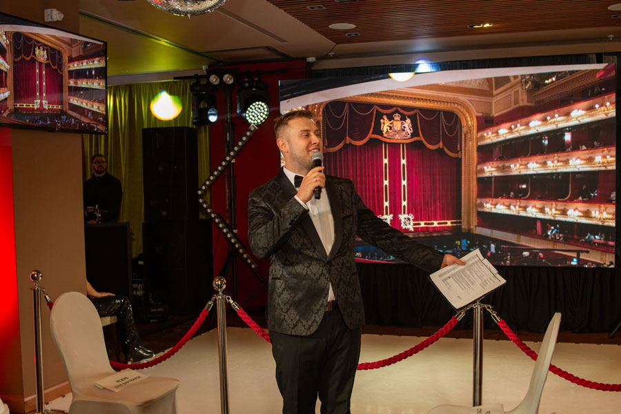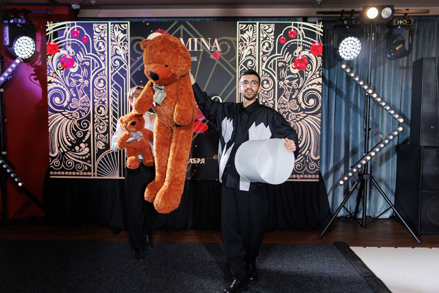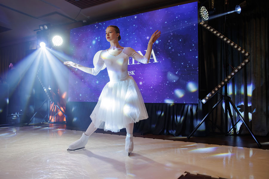 В зале царила атмосфера сказочной магии: сверкающая ледовая сцена, грациозные выступления артистов балета на коньках, виртуозное выступление скрипача с пылающим смычком, впечатляющий показ коллекции от модного бренда Luisa Spagnoli, розыгрыш призов и торжественный вынос огромного торта.
