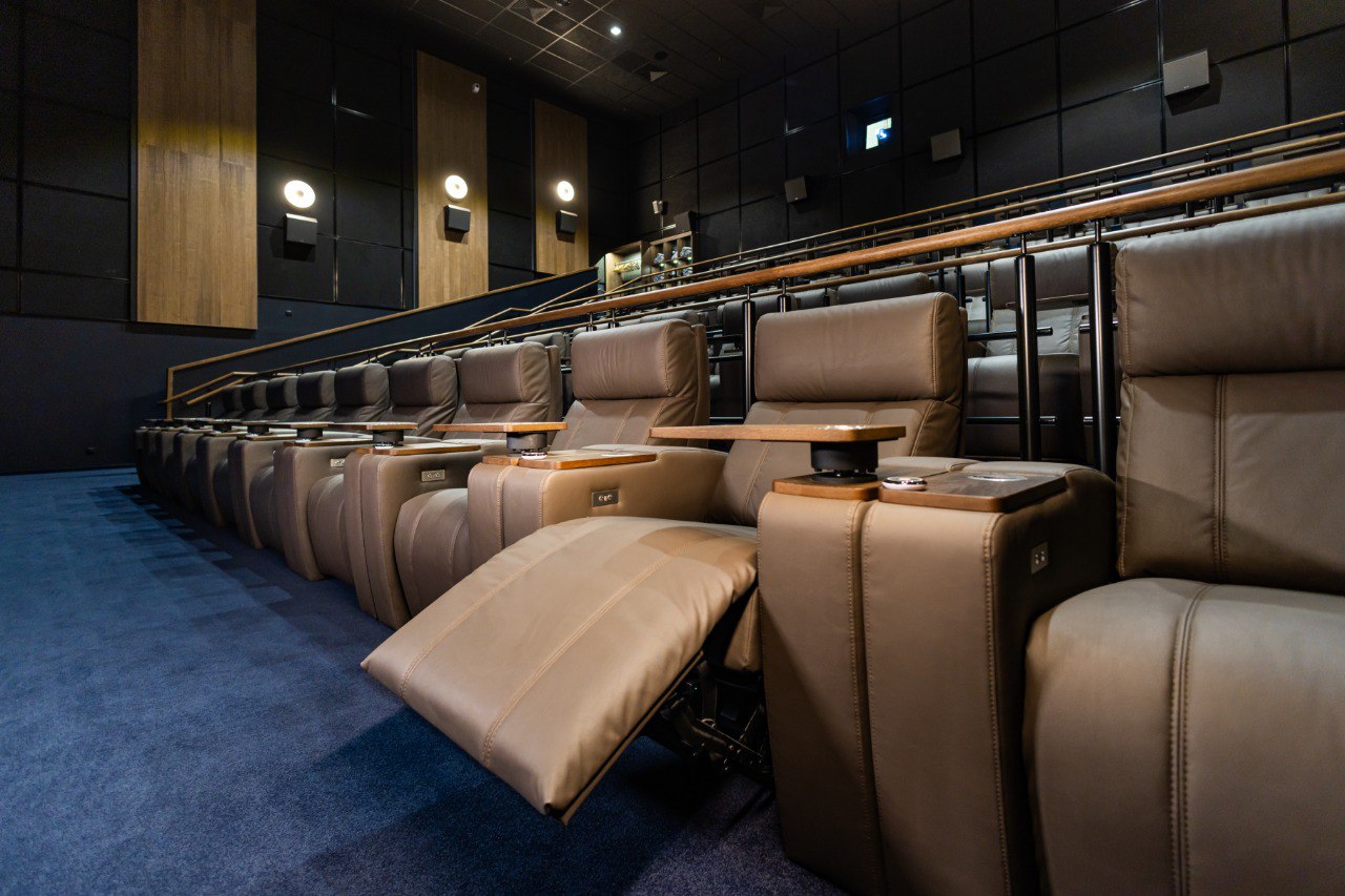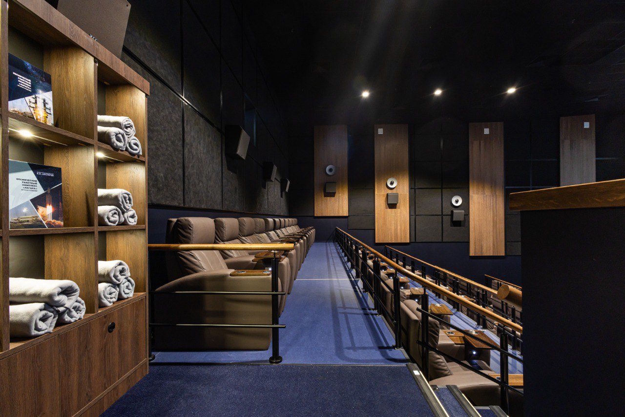 Зал оборудован премиальными креслами с функцией расслабляющего массажа. В каждом кресле предусмотрены беспроводная зарядка для мобильных устройств и кнопка вызова консъержа — заказы из кинобара доставляют прямо к месту. Также для гостей предусмотрены отдельный гардероб и пледы.⠀