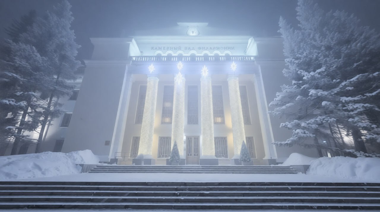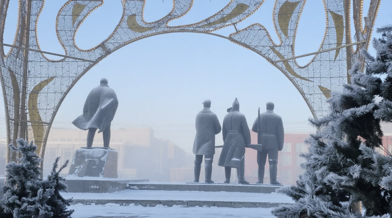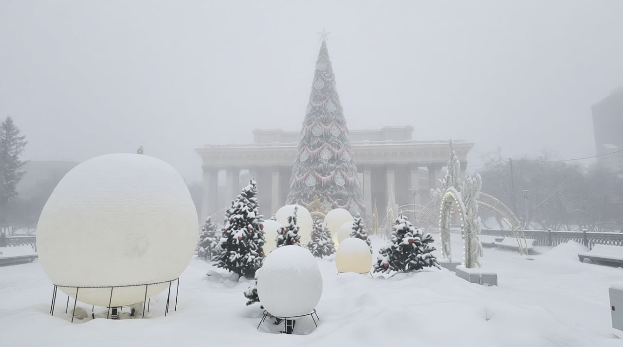 Суровые морозы превратили город в настоящую зимнюю сказку: воздух наполняется легкой снежной дымкой, деревья покрыты пушистым слоем инея, свет уличных фонарей отражается в сверкающем снегопаде.