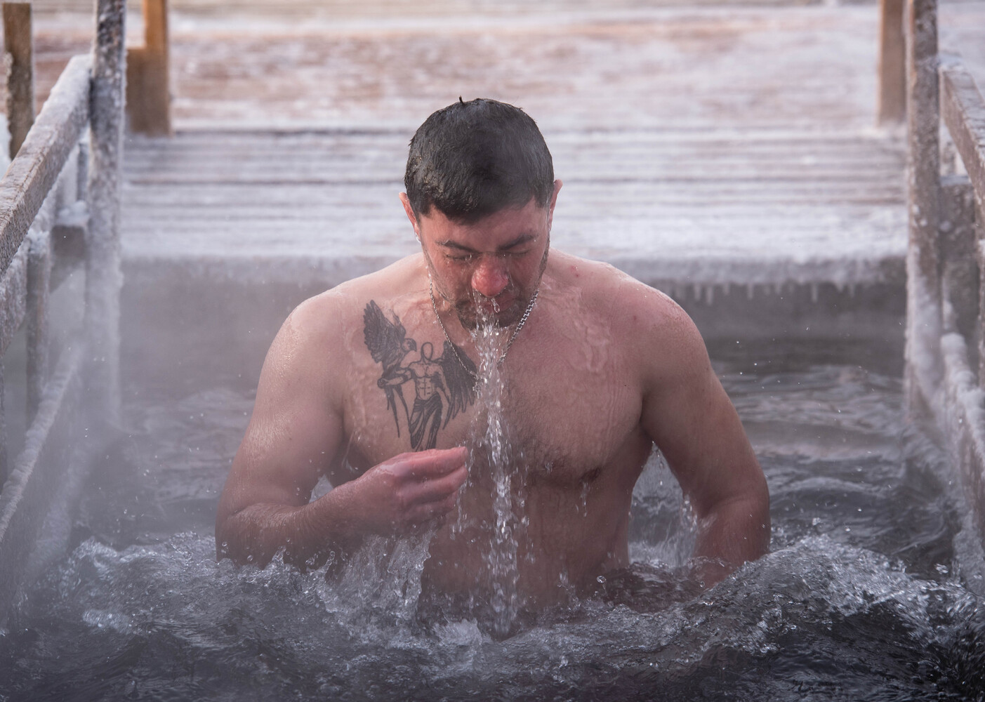 Фоторепортер портала Сиб.фм Александр Свирщевский снял серию ярких кадров, показывающих самые запоминающиеся моменты купания. Особое внимание уделено сильным и уверенным мужчинам, обладающим внушительной мускулатурой, эффектными украшениями и заметными татуировками.