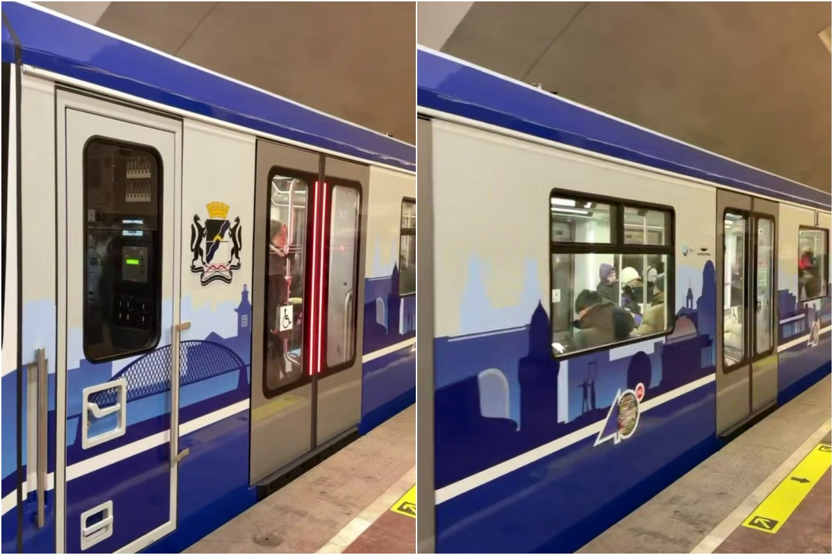 На линию Новосибирского метро вышел необычный поезд «Ермак». Он в юбилейной ливрее, а еще с символикой города.