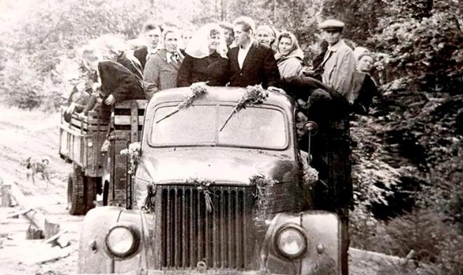 Деревенская свадьба. Молодожены едут на грузовом автомобиле, чтобы обменяться кольцами. Несмотря на послевоенные трудности, их счастье в этот день не знает границ.