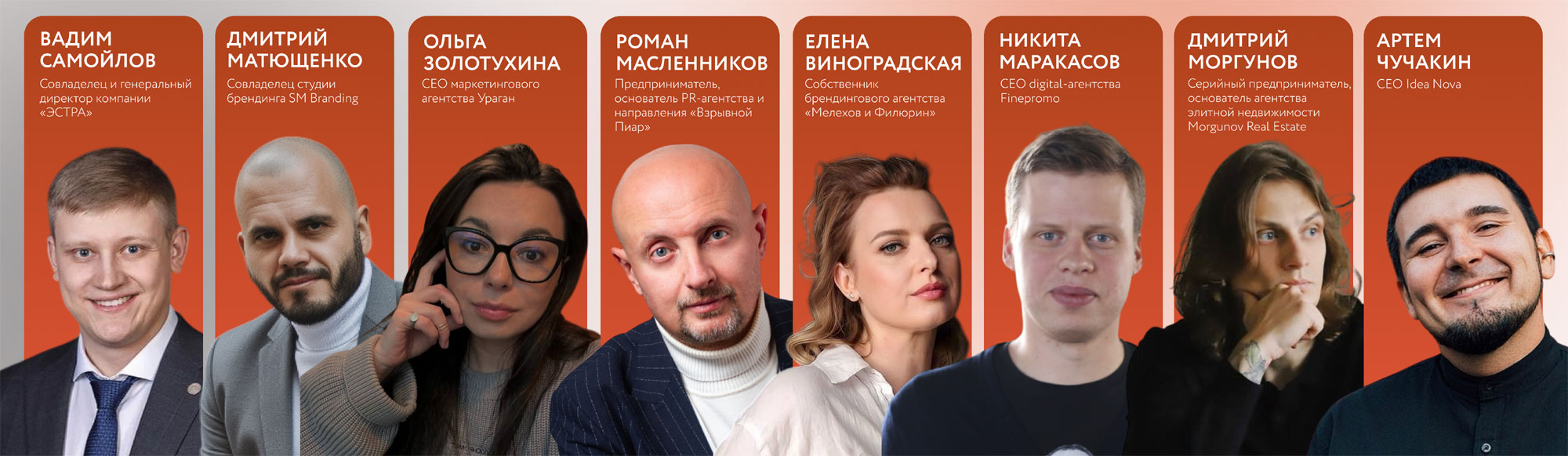 Среди спикеров также: Вадим Самойлов (совладелец и генеральный директор компании «ЭСТРА»), Дмитрий Матющенко (совладелец студии брендинга SM Branding), Дмитрий Моргунов (основатель агентства элитной недвижимости Morgunov Real Estate), Артём Чучакин (CEO Idea Nova), Елена Виноградская (собственник брендингового агентства «Мелехов и Филюрин»), Никита Маракасов (CEO digital-агентства Finepromo), Ольга Золотухина (СЕО маркетингового агентства «Ураган»).