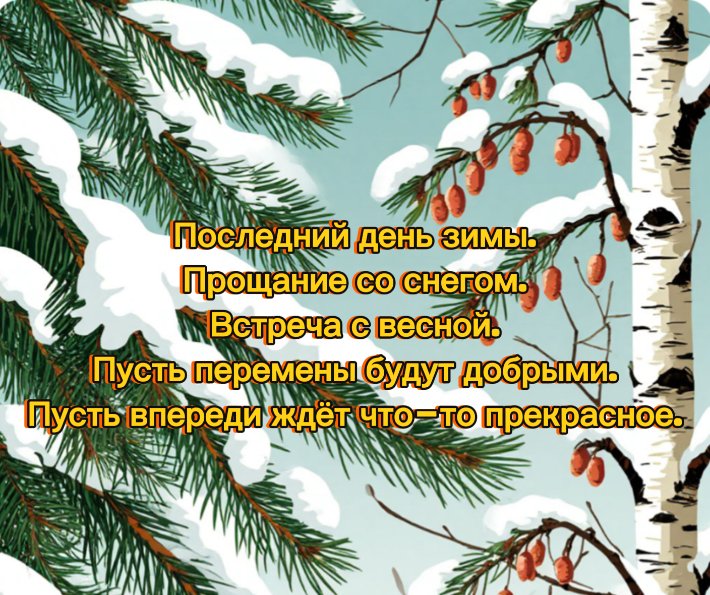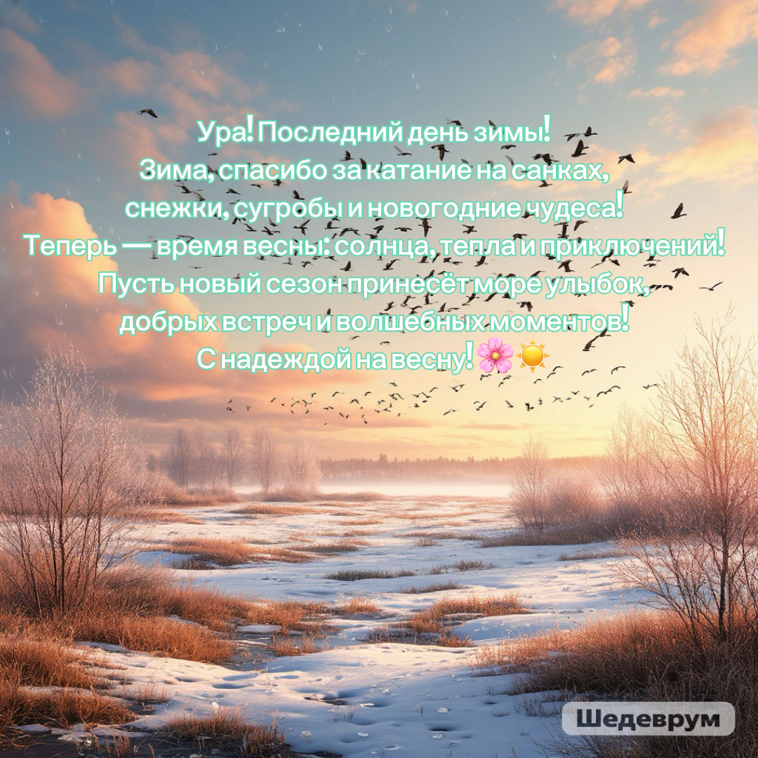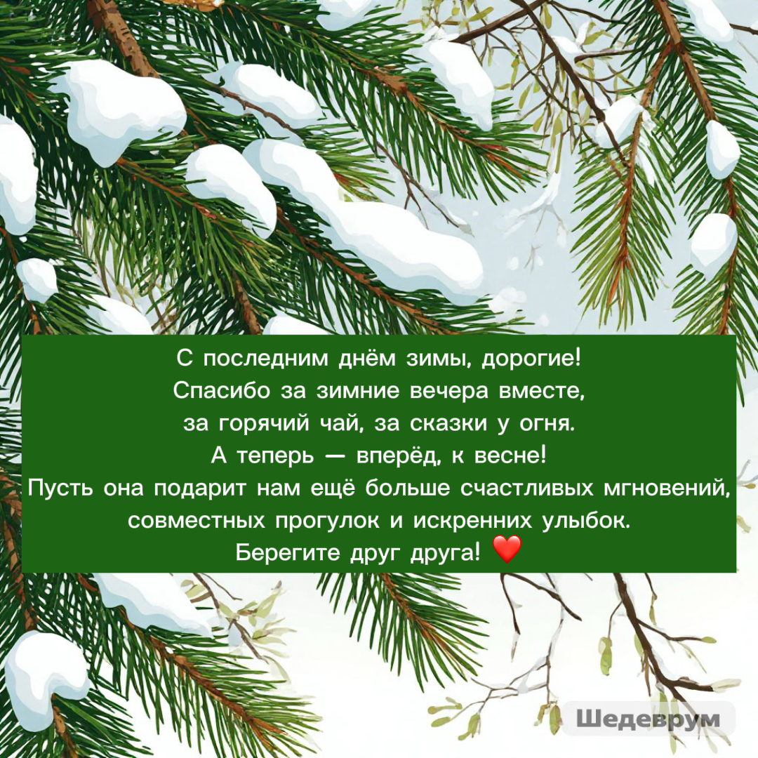 Открытки, приуроченные к последнему дню зимы, являются отличным способом поздравить родных и друзей с окончанием морозов и началом весеннего обновления. В таких открытках обычно можно найти искренние пожелания, а также картинки, отражающие как зимнюю атмосферу, так и первые признаки весны, символизирующие переход от одного сезона к другому.