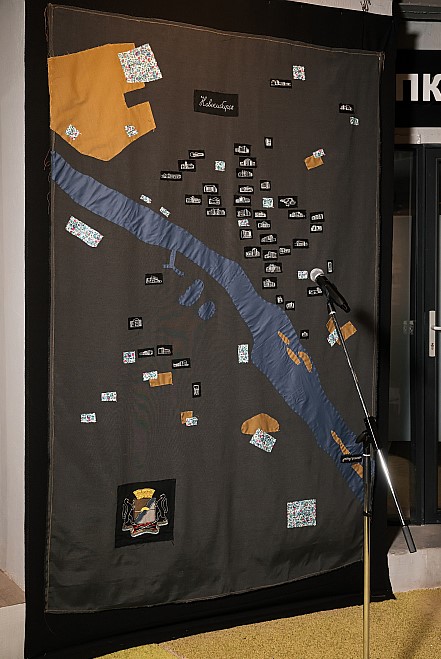 Отдельная большая работа, которую Саша Браулов специально подготовил к выставке – масштабная карта Новосибирска, выполнена в технике вышивки и аппликации. На ней размещены практически все конструктивистские здания нашего города.