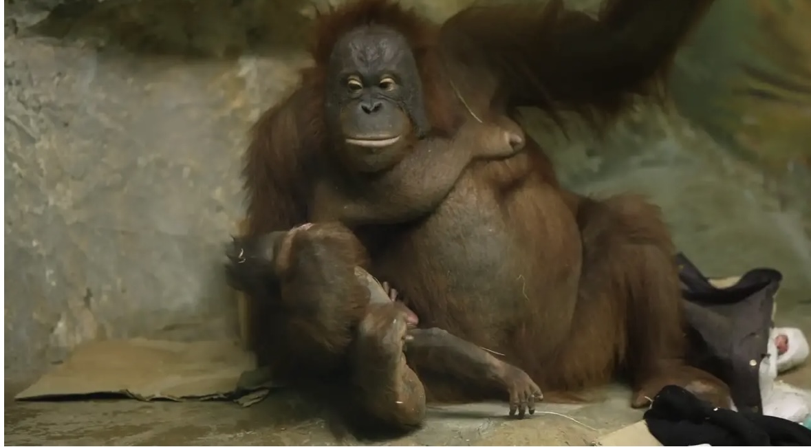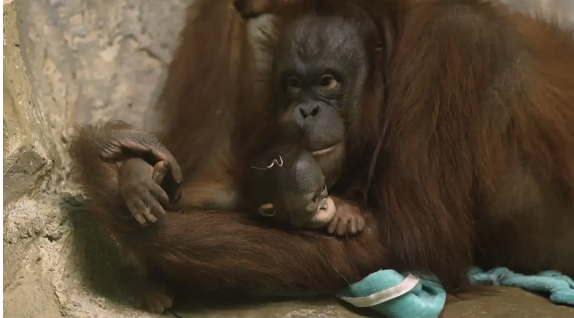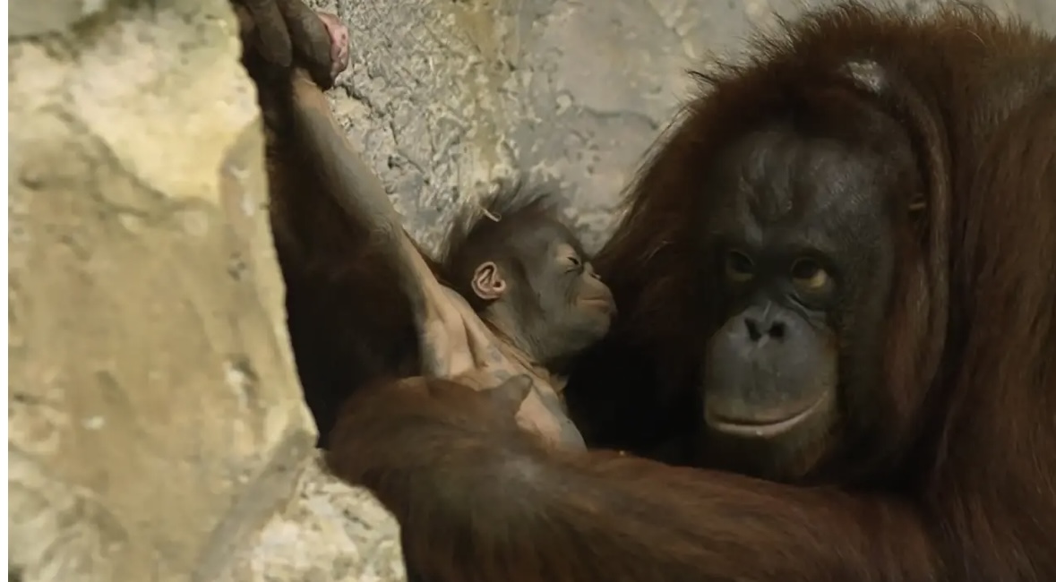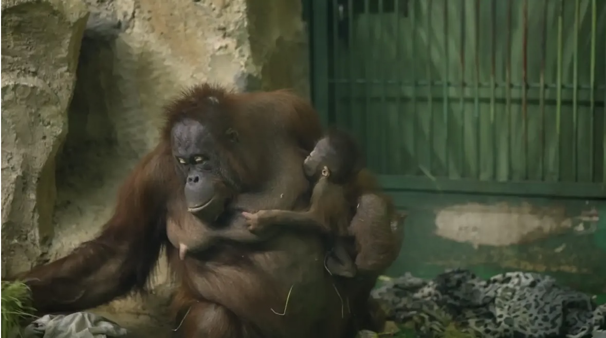 У пары орангутанов Бату и Мишель ближе к концу прошлого года родилась самка. Малышка уже уверенно перемещается по вольеру и проявляет активный интерес к окружающему пространству. Особенно её привлекает тактильное познание: она подолгу изучает тело матери на ощупь. Детство у орангутанов длится значительно дольше, чем у большинства других животных, — даже в возрасте одного года маленькие человекообразные обезьяны остаются полностью зависимыми от взрослых. Именно этим объясняется исключительно развитый родительский инстинкт у данного вида, который, к тому же, наиболее близок человеку по структуре ДНК.