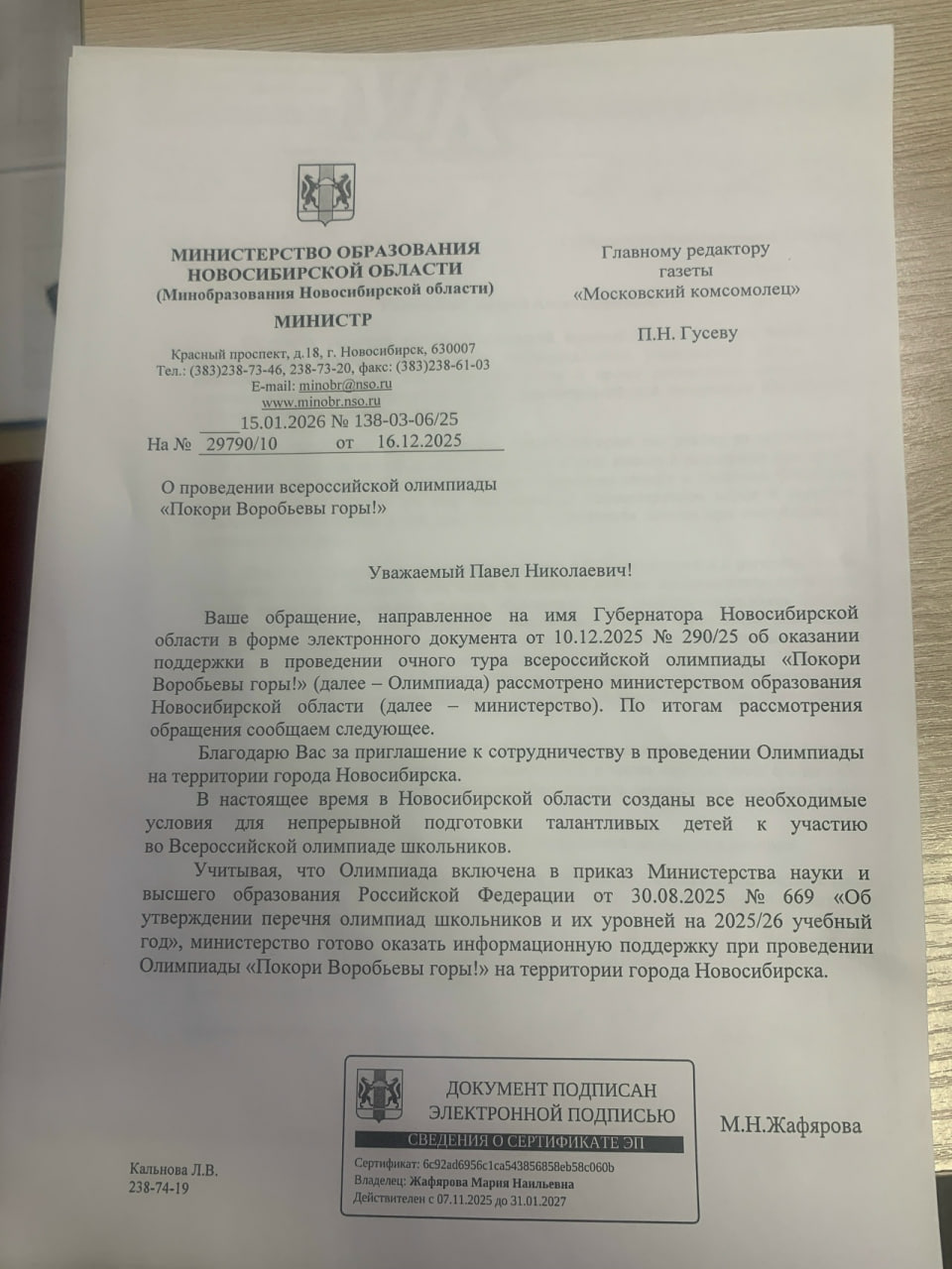 «Благодарю Вас за приглашение к сотрудничеству в проведении Олимпиады на территории Новосибирска. В настоящее время в Новосибирской области созданы условия для непрерывной подготовки талантливых детей к участию во Всероссийской олимпиаде школьников. Министерство готово оказать информационную поддержку», — написала Мария Жафярова.