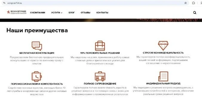 Бойцам и их семьям обещают качественный сервис на основе статистики из «99% положительных решений» по таким вопросам как «Снятие СОЧ» (то есть закрытие уголовного дела о незаконном оставлении военной части), увольнение с военной службы по состоянию здоровья и другим щепетильным и безусловно сложным вопросам, связанными с СВО.