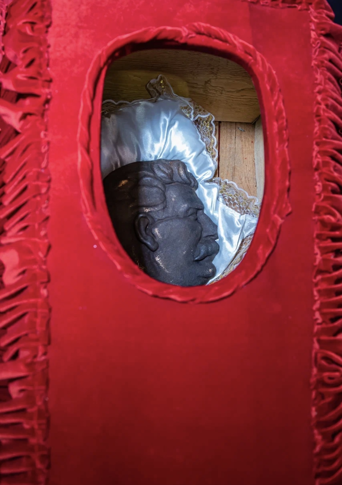 Однако самым неожиданным экспонатом выставки оказалась инсталляция, запечатлённая фотографом Сиб.фм. Речь идёт о скульптурном изображении Иосифа Сталина, помещённом в гроб, обитый красной тканью с оборками. Этот объект вызвал неоднозначную реакцию у публики — от недоумения до бурного обсуждения.
