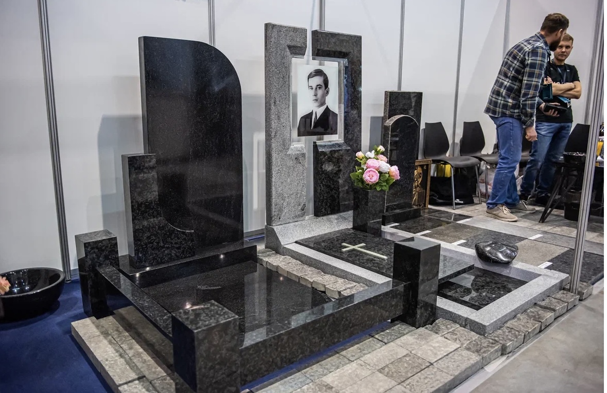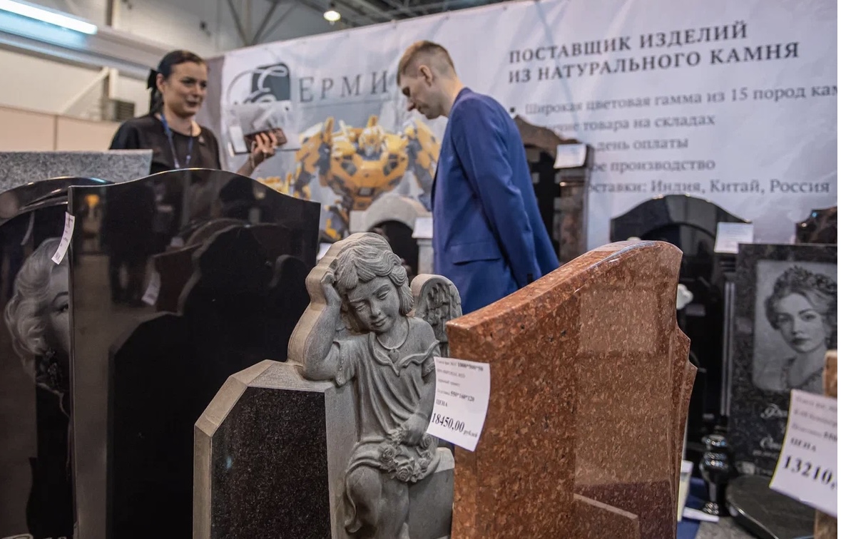 В новосибирском «Экспоцентре» производители мемориальной продукции удивили публику портретами звёзд на памятниках и неоднозначной скульптурой в красном гробу.