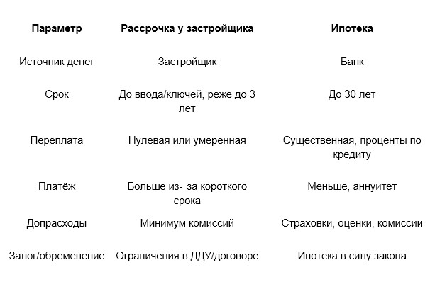 Главные отличия: деньги даёт застройщик, а не банк. Срок короче, переплата ниже или нулевая, но платёж больше. И расходов на страховки минимум, зато график менее гибкий.