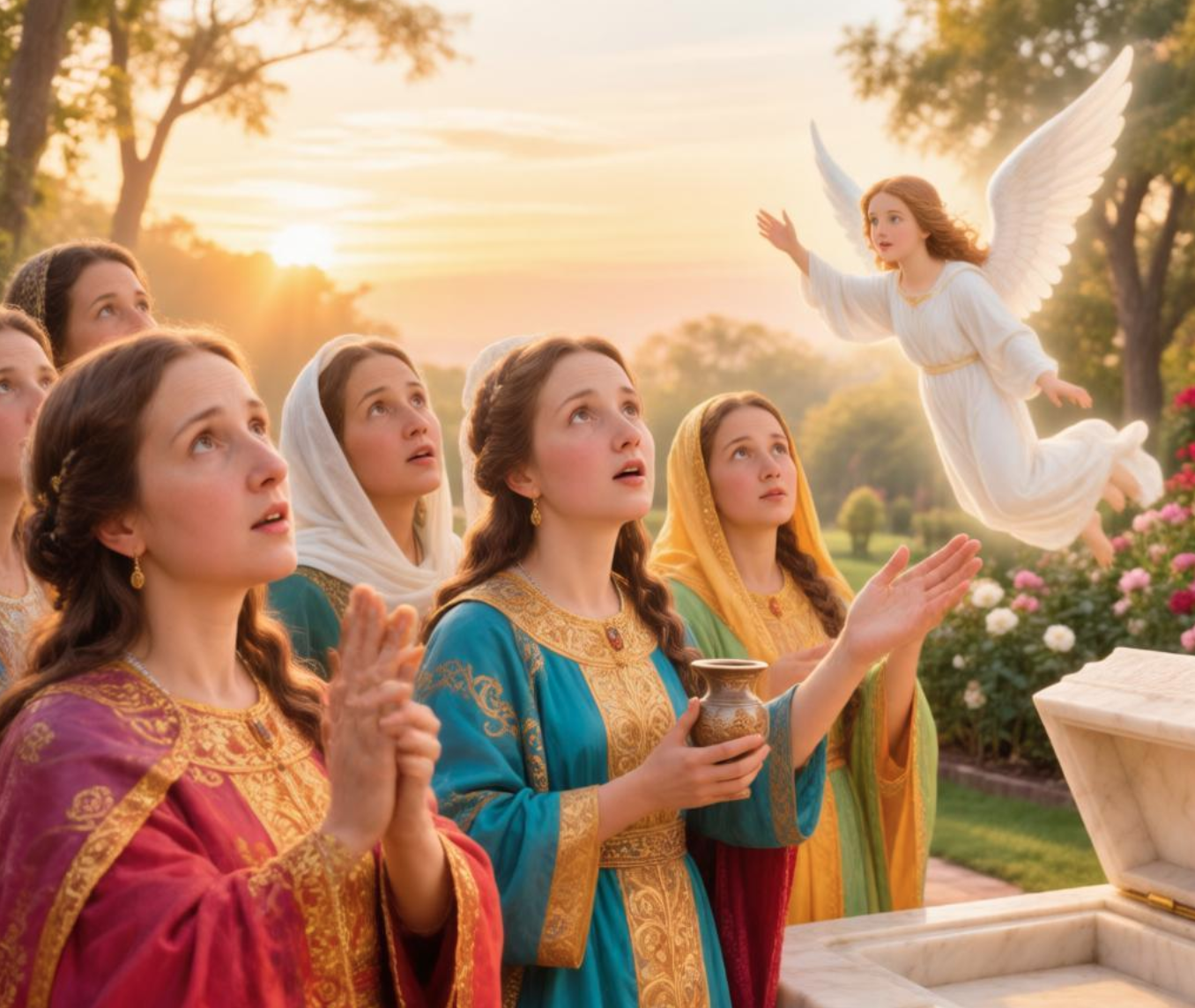 В Евангелии рассказывается, что рано утром в воскресенье они пришли ко гробу с миром, чтобы завершить погребальный обряд. Там их встретил Ангел, возвестивший о Воскресении Христа. Именно женам-мироносицам было доверено первыми узнать о победе жизни над смертью и передать эту весть апостолам.