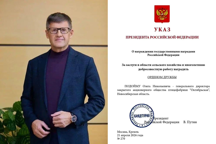 «За заслуги в области сельского хозяйства и многолетнюю добросовестную работу Орденом Дружбы награжден Подойма Олег Николаевич, генеральный директор закрытого акционерного общества птицефабрики «Октябрьская» Новосибирской области», – говорится в документе.