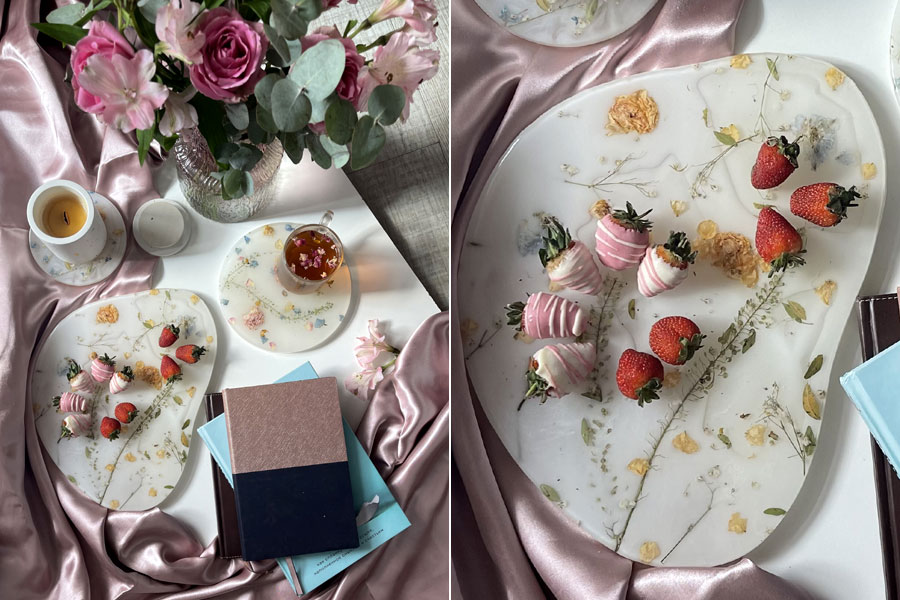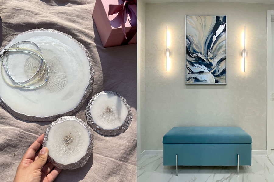 Второе направление – это различный декор для дома, включая подсвечники, кружки, тарелки и т.д. Берется застывший кусок смолы, изначально залитый в силиконовый молд, и обрабатывается до получения нужного предмета. В жидкую смолу можно поместить сухоцветы, золотую паталь, красивый кусок дерева – да всё что угодно! Встречаются крупногабаритные работы – например, огромные столы в гостиную, залитые вместе с деревянными слэбами. Изделие называется стол-река, совсем недавно они были на пике популярности, но сейчас мода несколько поутихла, хотя актуальность по-прежнему остается.