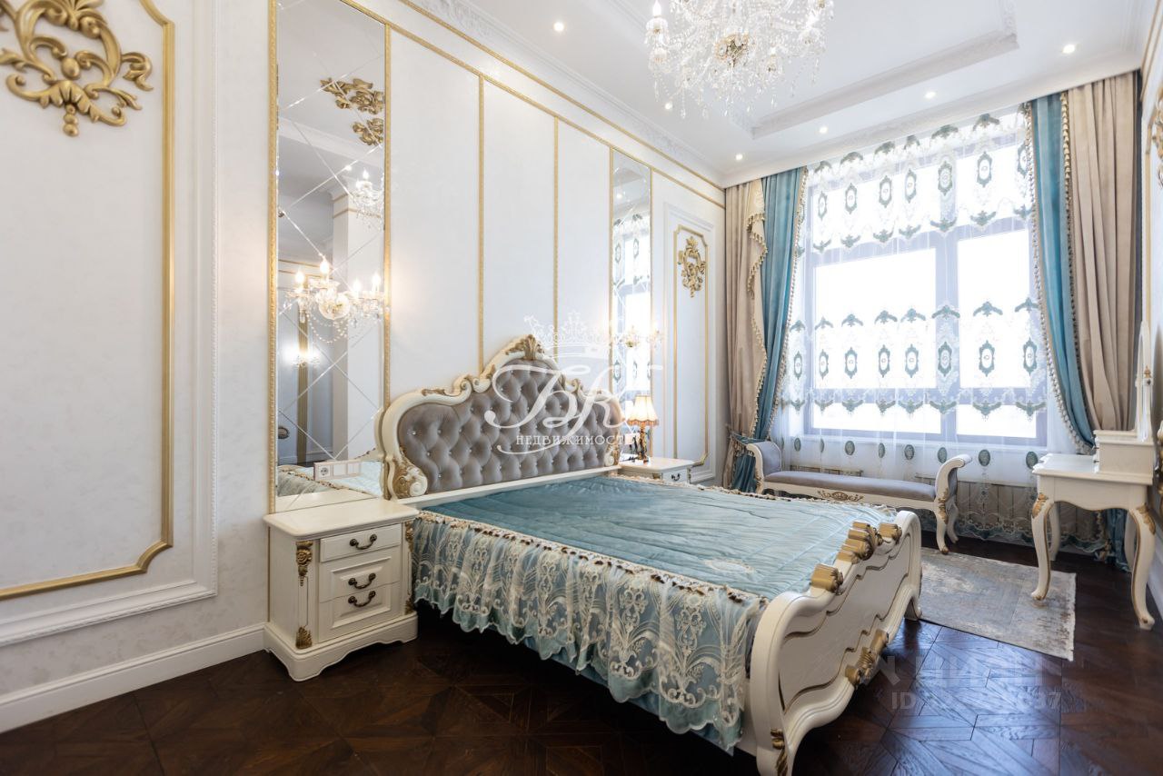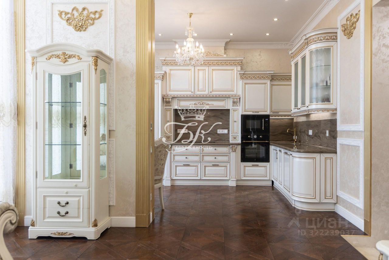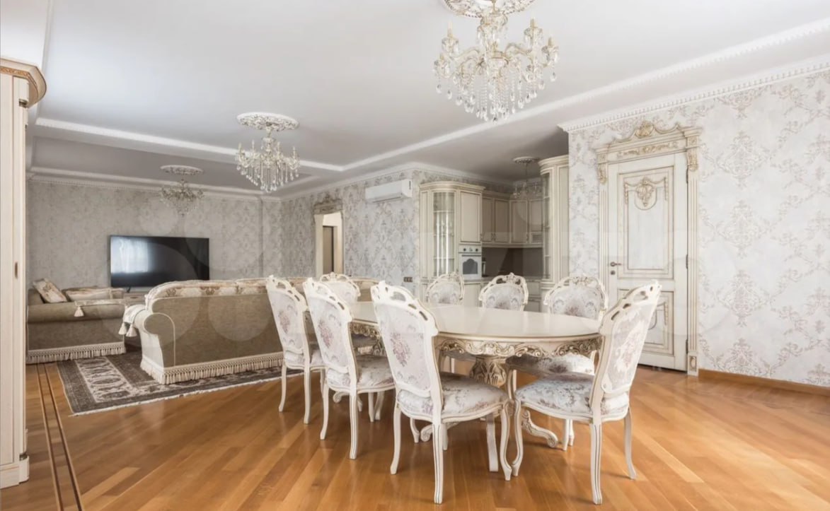 Пятикомнатная квартира площадью около 200 м². В интерьере вензеля. Он выдержан в едином стиле — от кухни до постирочной. Преимущества: всего две квартиры на этаже, лифт спускается на парковку. Нет шума от кондиционеров.