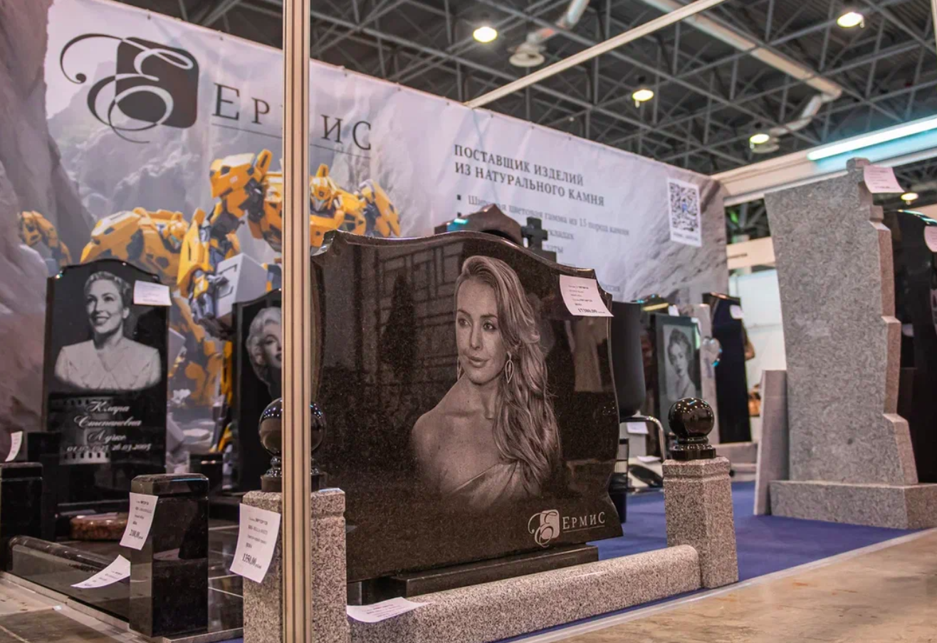 Среди экспонатов можно было увидеть надгробия с изображениями Мэрилин Монро и Жанны Фриске. Подобные образцы традиционно используются для демонстрации мастерства гравёров и качества обработки натурального камня, позволяя оценить уровень детализации, которого можно достичь при индивидуальном заказе.